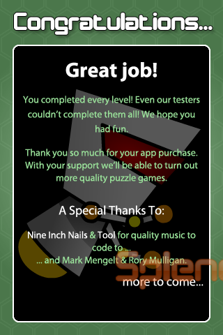 About 2 weeks ago I talked about Witty Bump. It's a maze puzzle with bumpers, wormholes and splitters. I just completed all 100 levels and the image above was my reward.