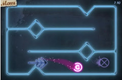 The puzzle reminds me of The World's Hardest Game. The object is to move the bright object from point A to point B without touching any of the lines. But here's the catch: you control the object by first pressing down on another object and moving it in the opposite direction.