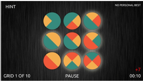 Look at the first image: your objective is to rotate each circle - using 90 degree turns - so that adjacent colors match.
