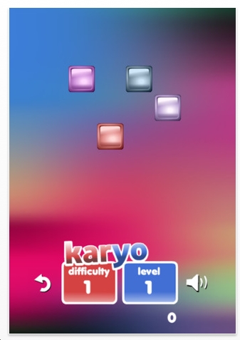 Karyo is a surprisingly fun logical puzzle.  The object is to clear the board of the tiles by tapping in the space between 2 very close, but not touching, tiles.  When that happens, one tile will disappear and the other will move to the space tapped.