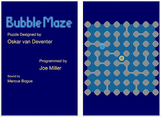 Bubble Maze was designed by my Dutch friend Oskar van Deventer. The object is to tilt your device so that the blue bubble will eventually land on the yellow dot. Joe Miller did the programming work.