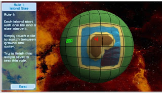 Islands Planet: this is a spherical version of Nurikabe from Nikoli press in Japan. Each square is either land or ocean. No two islands can touch each other. Diagonal touching is okay. There cannot be a 2x2 grid that contains only ocean. Also, you cannot create a lake that is enclosed. See the second image for that.