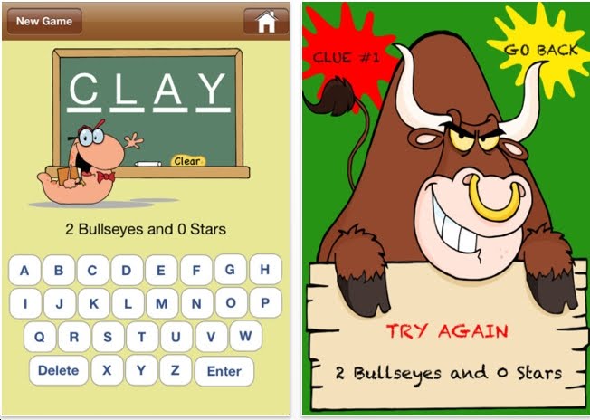 Word BullsEye is similar to Mastermind. The object is to guess the correct 4 letter word. Suppose you guess B-L-U-E. If the bull says you got 1 bullseye, then one letter is correct. 1 star means that the letter is correct, but in the wrong location.