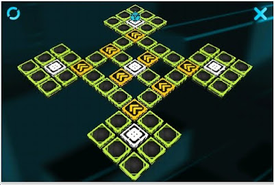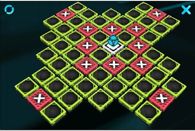 Crazy Cubes is similar to TEC and to Hex-A-Hop. The object is to roll your cube over each of the green tiles once and only once to destroy them. A big red X tile: roll over that and you have 5 seconds to get out of the way before it explodes itself and the surrounding 8 tiles.