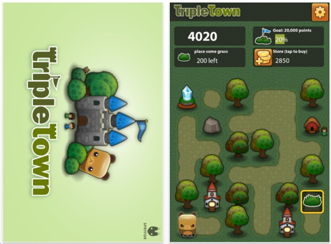 Place 3 grass tiles together and they turn into a bush. 3 bushes turn into a house. You get the idea. This is a very good game, one of the best puzzle apps of 2012. However, for my money, Tripevo is the better game.