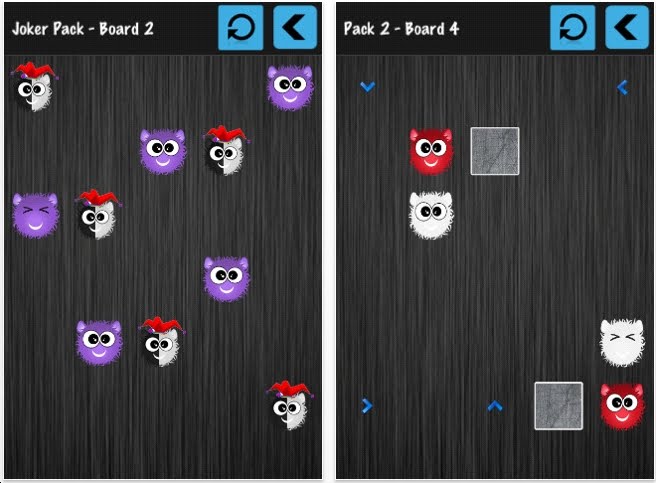 Fuzzy Logic is a great puzzle app! It is very similar to Lunar Lockout, Fling, and Frogiz. The object is to eliminate the board with matching colors. Blue will cancel with blue. But blue will combine with red to make purple. Like Lunar Lockout, blue will stop at the space just before green, or purple.