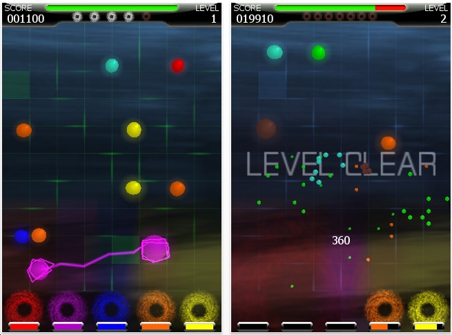 Mixt has great graphics, download it just to check that out. The object: drag the colored balls to the matching holes. Combine balls into bigger balls for more points.