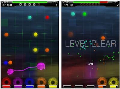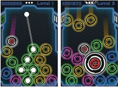 Photon is listed as a puzzle app, but it's really an arcade game. Discs fall down. Drag your finger across discs of the same color to score points and eliminate them.