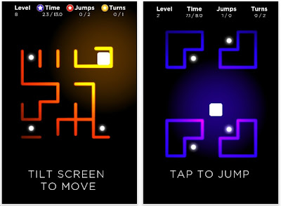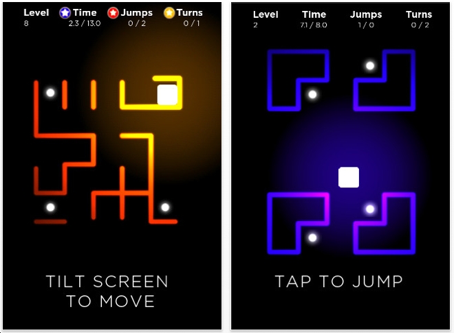 Neon Zone is a free iphone ipad puzzle app. Keep your device horizontal. Tap anywhere on the screen to place your cube. Then glide it by tilting to capture all the lights.