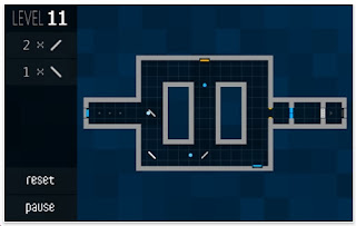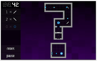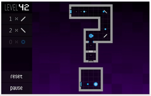 Micron is a mirror-maze puzzle app which requires an element of timing. Bullets are shot from the starting point. In the case above that starting point is the blue mark on the extreme left. The target is the grey target on the extreme right.