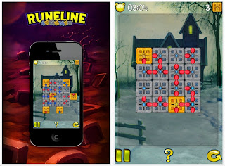 Runeline is an edge-matching puzzle. Grey Runes can rotate and move. Yellow Runes are fixed, but they can rotate. Blue Runes cannot move or rotate.
