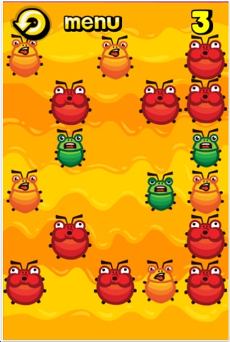 The object of Stoked is to eliminate all the bugs - in this case - with 3 taps. Tap on a red bug and it shoots 1 bullet in each direction. This leads to massive chain reactions. Only red bugs will fire bullets and disintegrate.