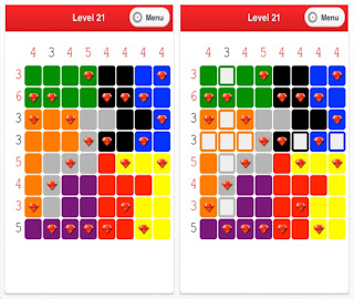 TapGem is a very interesting puzzle app game. The object is to place 4 gems on each colored region and ensure that each row and column has the correct number of gems as indicated. See the left margin and the row of numbers on the top.